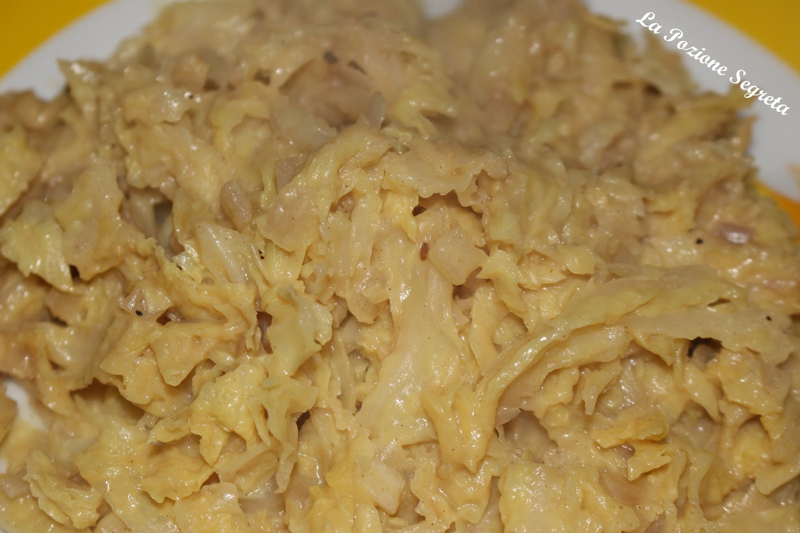 Pulire in cavolo verza, togliere dalle foglie la costa centrale e tagliarlo a listarelle, fare un soffritto con lo scalogno tritato e l'olio, unire quindi la verza, salare, pepare e farla insaporire. Stemperare la senape (le quantità dipendono dal vostro gusto) in un bicchiere d'acqua e versarla nella padella, quindi portare a cottura aggiungendo man mano altra acqua se necessario.